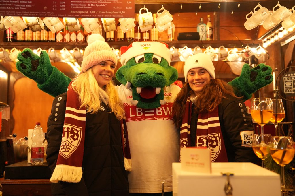 Der Stand „Weihnachtsparadies mit Herz“ von Sonja Merz war auch 2025 ein echter Publikumsmagnet auf dem Stuttgarter Weihnachtsmarkt. Im Einsatz für die VfB-Stiftung engagierten sich zahlreiche VfBler für den guten Zweck. Den Auftakt machten Spielerinnen des Frauenteams: Torhüterin Kiara Beck und Mittelfeldspielerin Janina Hechler begrüßten die Gäste, bevor die Verteidigerinnen Katharina Schäfer und Linette Hofmann den Ausschank übernahmen. Einen Tag später sorgten die VfB-Legenden Guido Buchwald, Hansi Müller und Cacau für Glühwein und persönliche Gespräche.