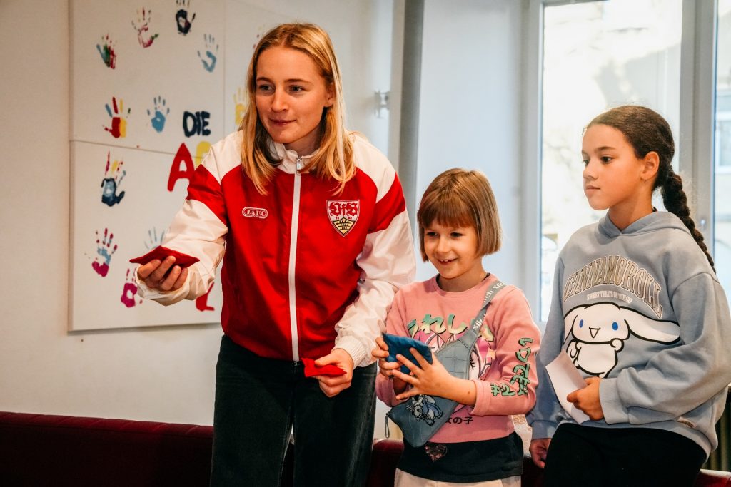 Schon beim Ankommen in der Danneckerstraße in Stuttgart-Mitte wurde deutlich, wie sehr sich die Kinder auf den Besuch der VfB Frauen gefreut hatten: Lachen, neugierige Fragen und eine spürbare Aufregung erfüllten die Räume. Ob beim Tischkickern, Basteln, Fußball im Mattenraum oder beim „Cornhole“ (Anm. d. Red.: Beliebtes Freizeitspiel, bei dem kleine Säckchen gezielt in ein Loch geworfen werden müssen) – die Spiele-Olympiade wurde schnell zu einem Ort gemeinsamer Freude und vieler persönlicher Gespräche. „Für die Arche und vor allem für die Kinder ist es eine unglaubliche Wertschätzung, wenn sich Menschen, in diesem Fall die VfB Frauen, Zeit für sie nehmen. Das freut uns sehr“, sagte Larissa Rauter, Regionalleiterin Arche Süd, zum Besuch der VfB Frauen.
