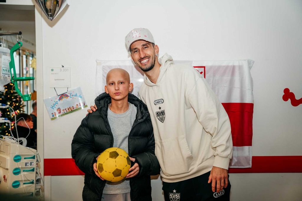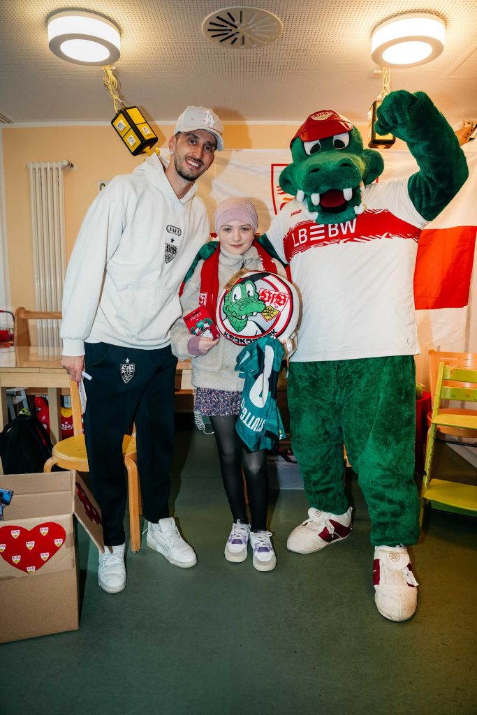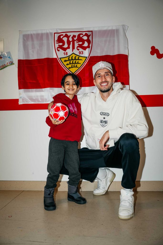 Mit viel Geduld und großer Aufmerksamkeit nahm sich der VfB-Kapitän für alle Zeit. Jedes Kind zählte und bekam die Zeit geschenkt, die es brauchte. Es wurde gescherzt, gestaunt, manchmal auch still Hand an Hand durch die Glasscheibe auf der Isolierstation gehalten. Das VfB Maskottchen Fritzle machte Quatsch und Lachen hallte durch die Flure der Station – ein Klang, der gerade hier so kostbar ist.